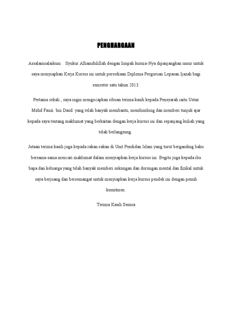 Contoh penghargaan contoh assignment penghargaan contoh penghargaan kerja kursus panduan penghargaan ayat penghargaan contoh ayat rujukan penghargaan. Kerja kursus sejarah sebagai sebahagian daripada syarat peperiksaan penilaian menengah rendah pmr 2013. Syukur Alhamdulillah kerana dengan izin tuhan yang Maha Esa kerana telah diberi kekuatan untuk menyempurnakan kerja kursus ini bagi mata pelajaran Geografi.